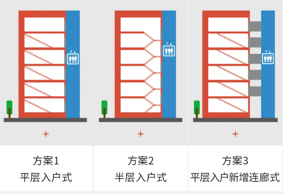 平层入户、半层入户、平层入户新增连廊等多种建造方案,根据楼体结构“量体裁衣”,解决了老楼加装电梯的空间适配难题。
