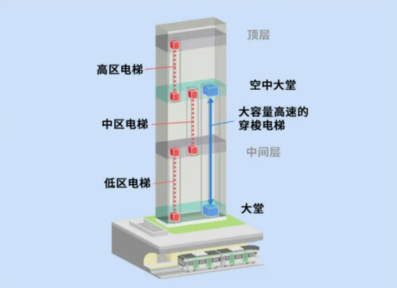 上海环球金融中心将楼层分为低/中/高区,通过大容量高速穿梭电梯将中高层乘客运到中转层,乘客再换乘本区电梯到目的楼层,大幅提升高层楼宇运输效率,激活客流。
